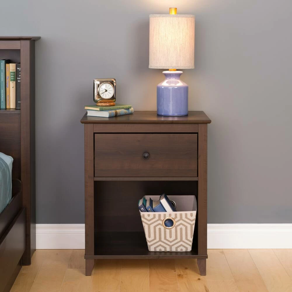 - Prepac 1-Drawer Yaletown Tall Nightstand adds a functional storage and organization solution to any bedroom