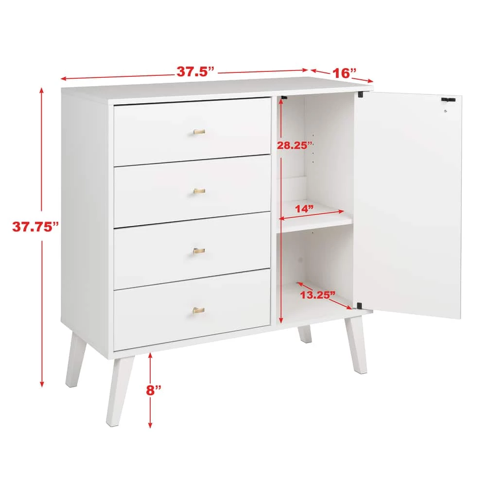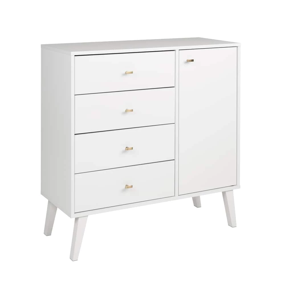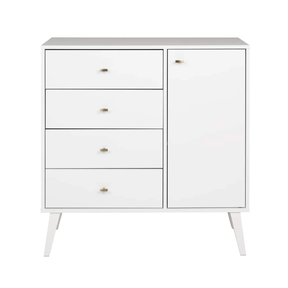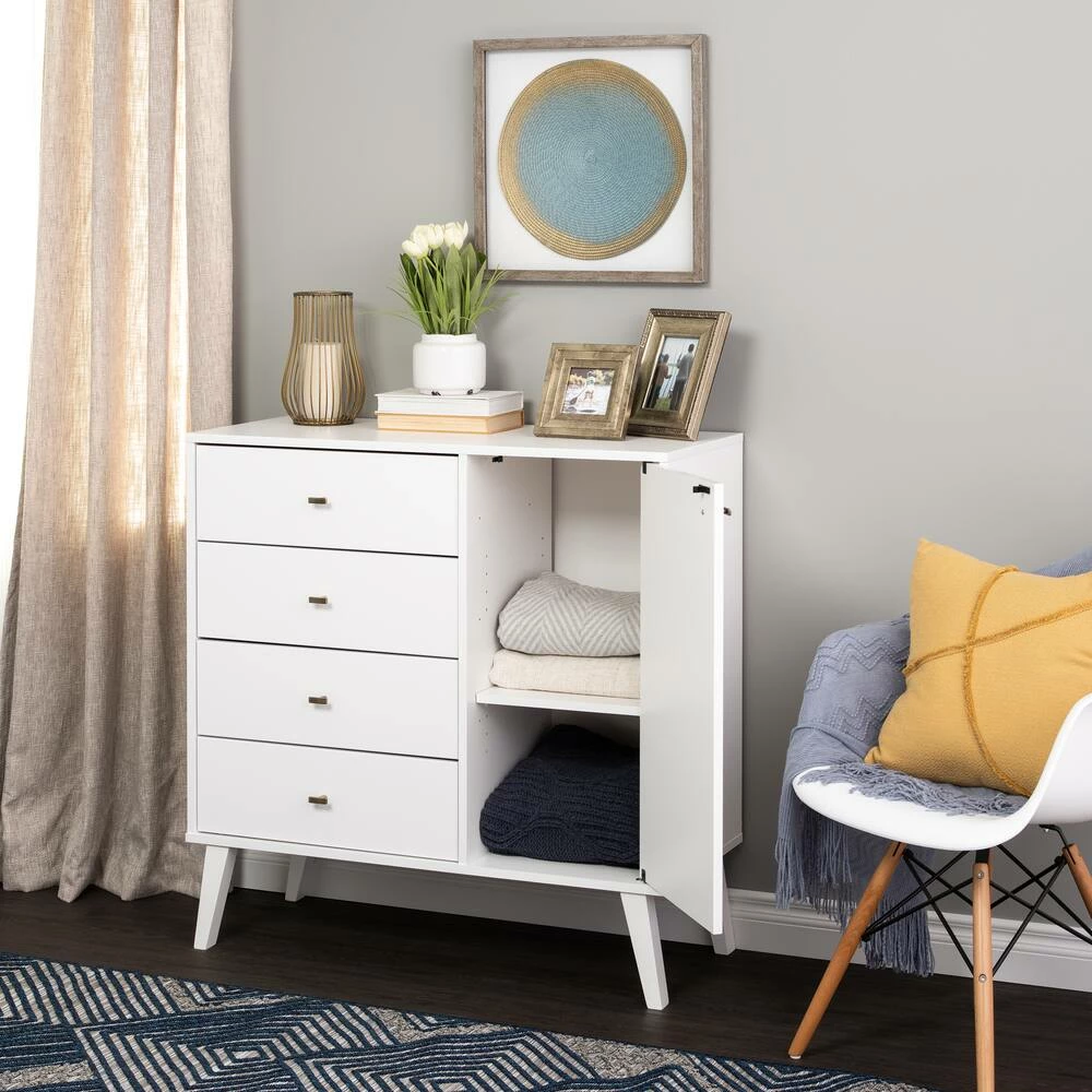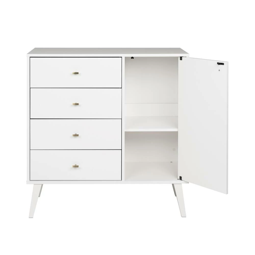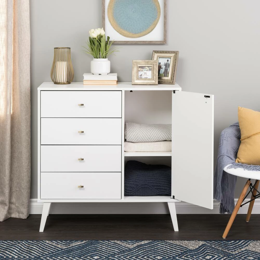 - Prepac 4-Drawer Milo Mid-Century Modern Chest with Door adds a retro stylish design with the functionality of extra storage and organization to any bedroom, dining room, or living room