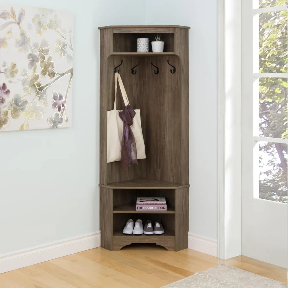 - Prepac Corner Hall Tree has a compact functional design that is ideal for tight entryways, hallways, and mudrooms