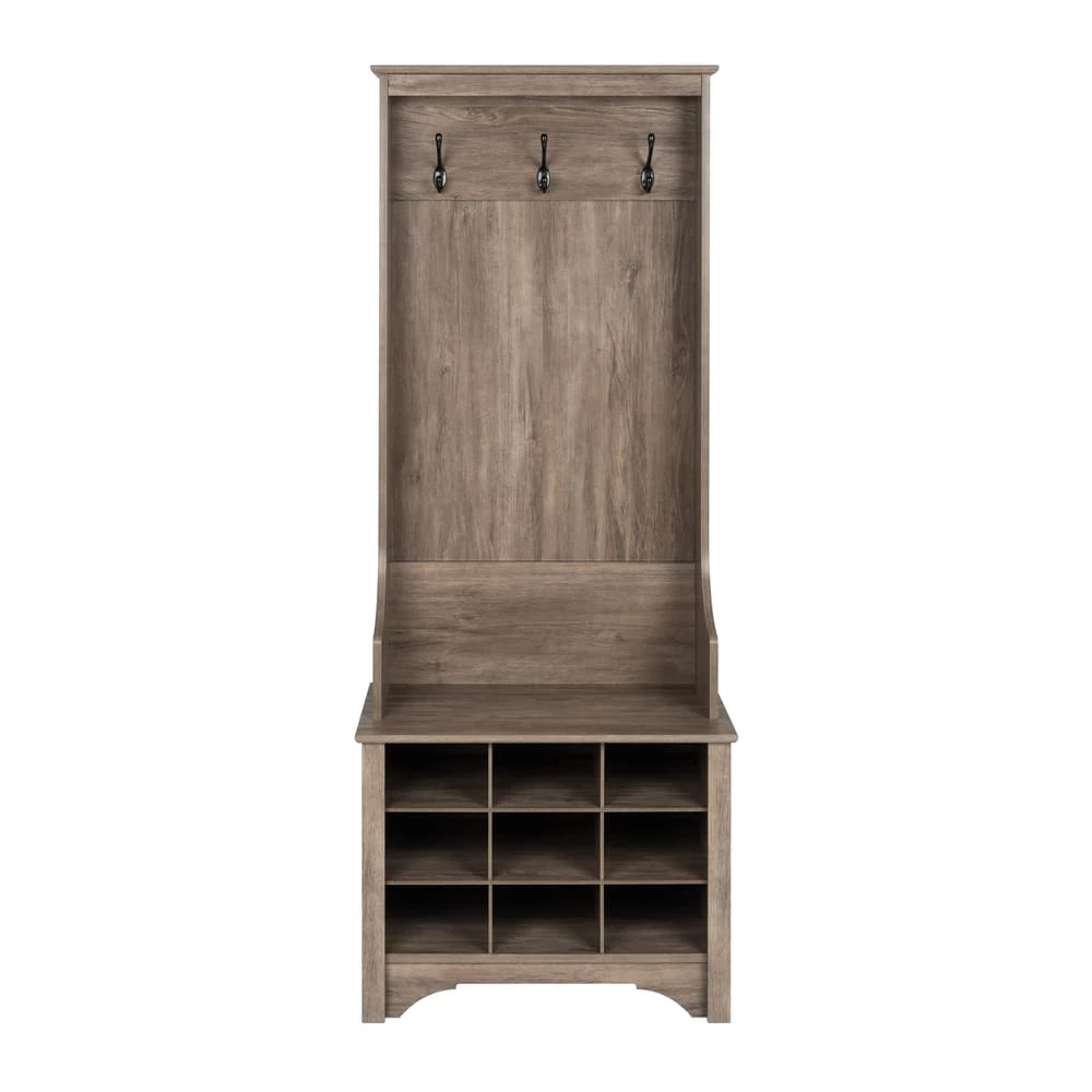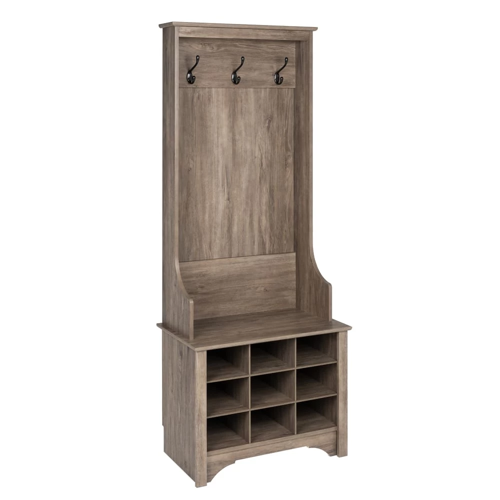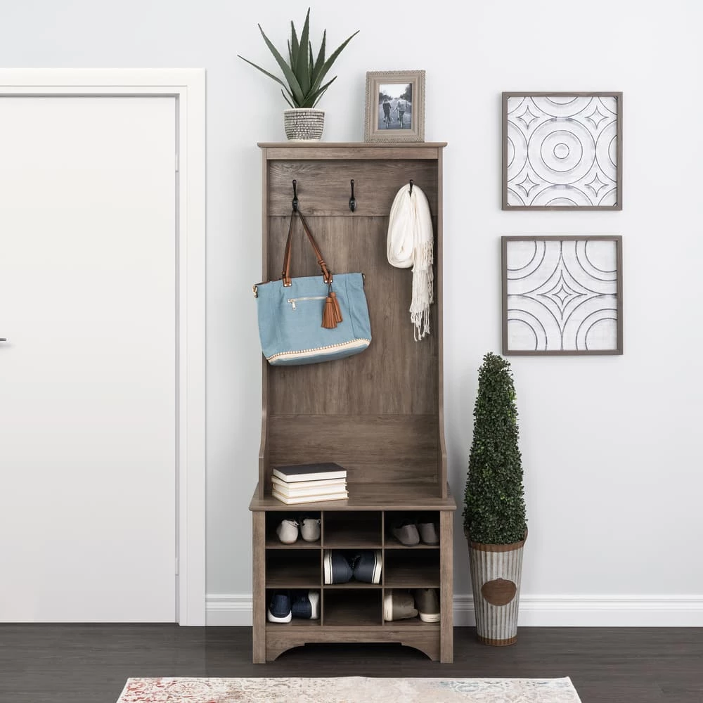 - Prepac Entryway Organizer with Shoe Storage features a stylish, compact design that allows the organizer to fit in any entryway